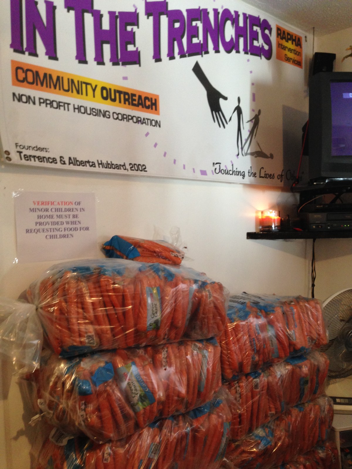 A wall of carrots ready to be distributed takes up precious space at In The Trenches